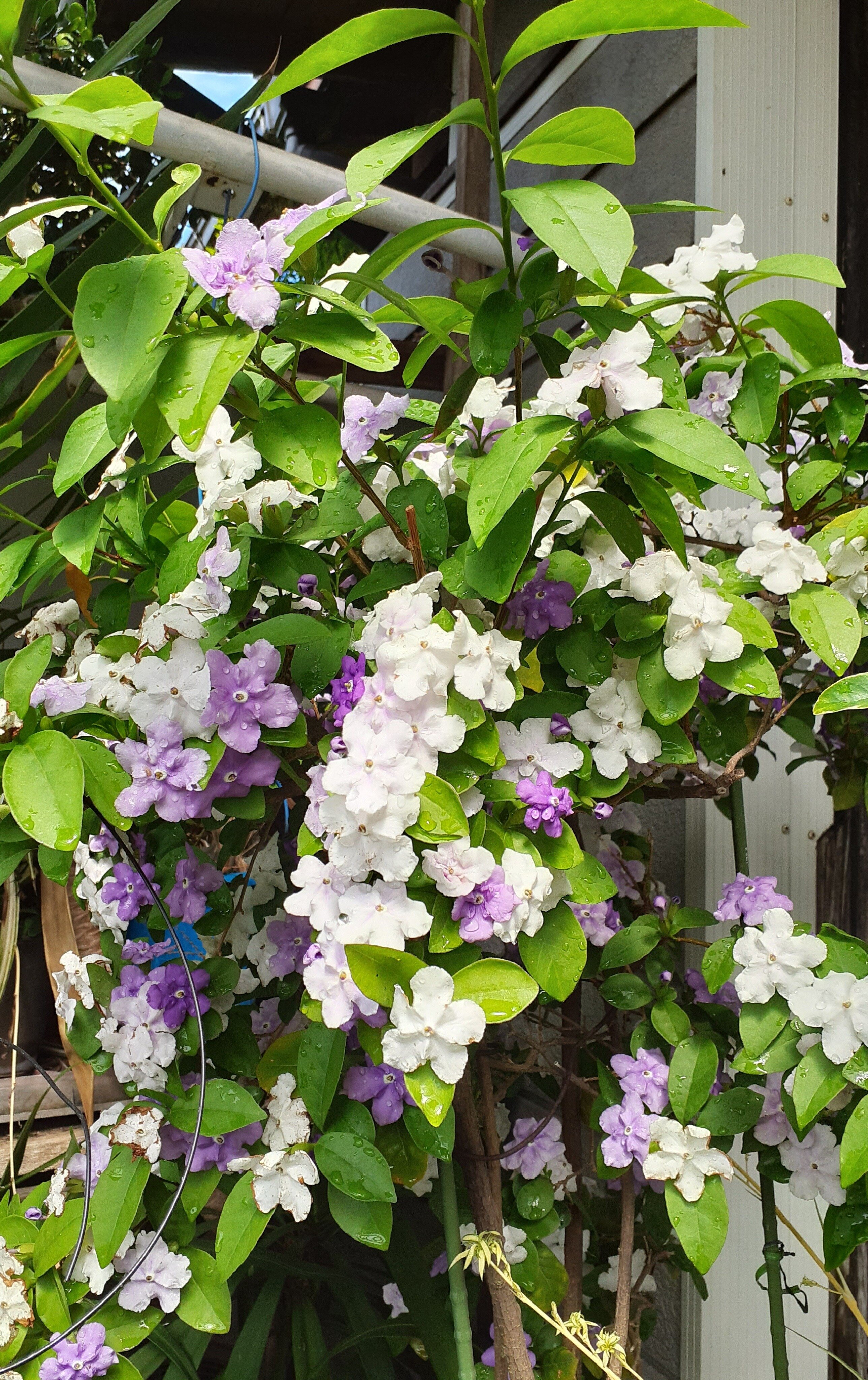 先日お迎えに行った時ひとつの幹から白、薄紫、紫と3色の花が咲いている木が。香りもすごく素敵。