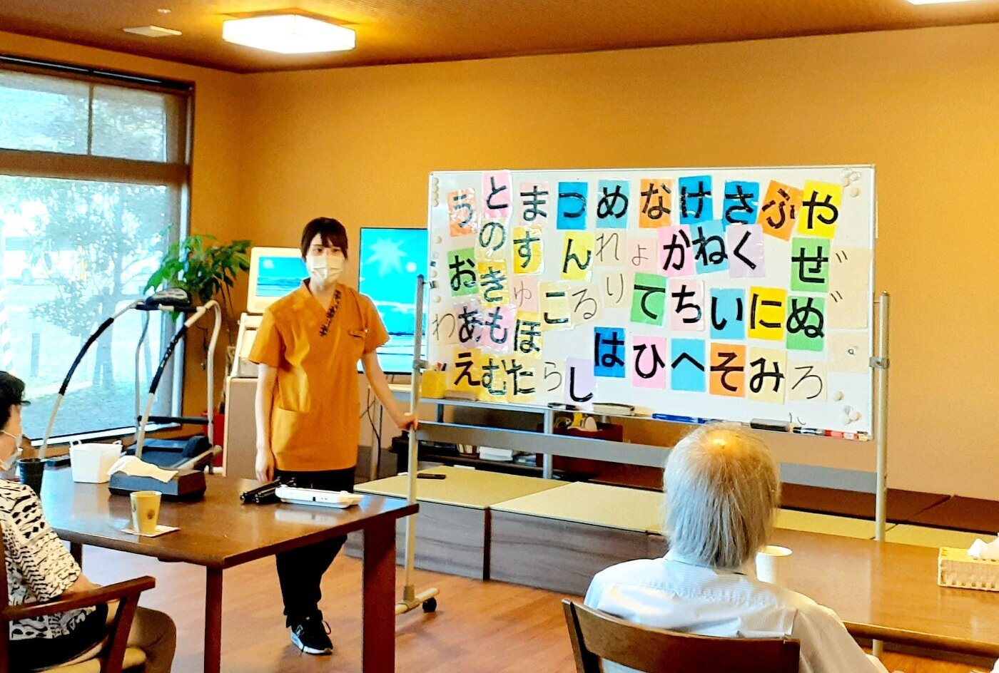 人気の脳トレレクのひとつ。ホワイトボードにカードを貼り言葉が出来たらカードを外していきます。 最後の方になるとカードが少なくなり苦笑い。苦しいながらも楽しい時間です。