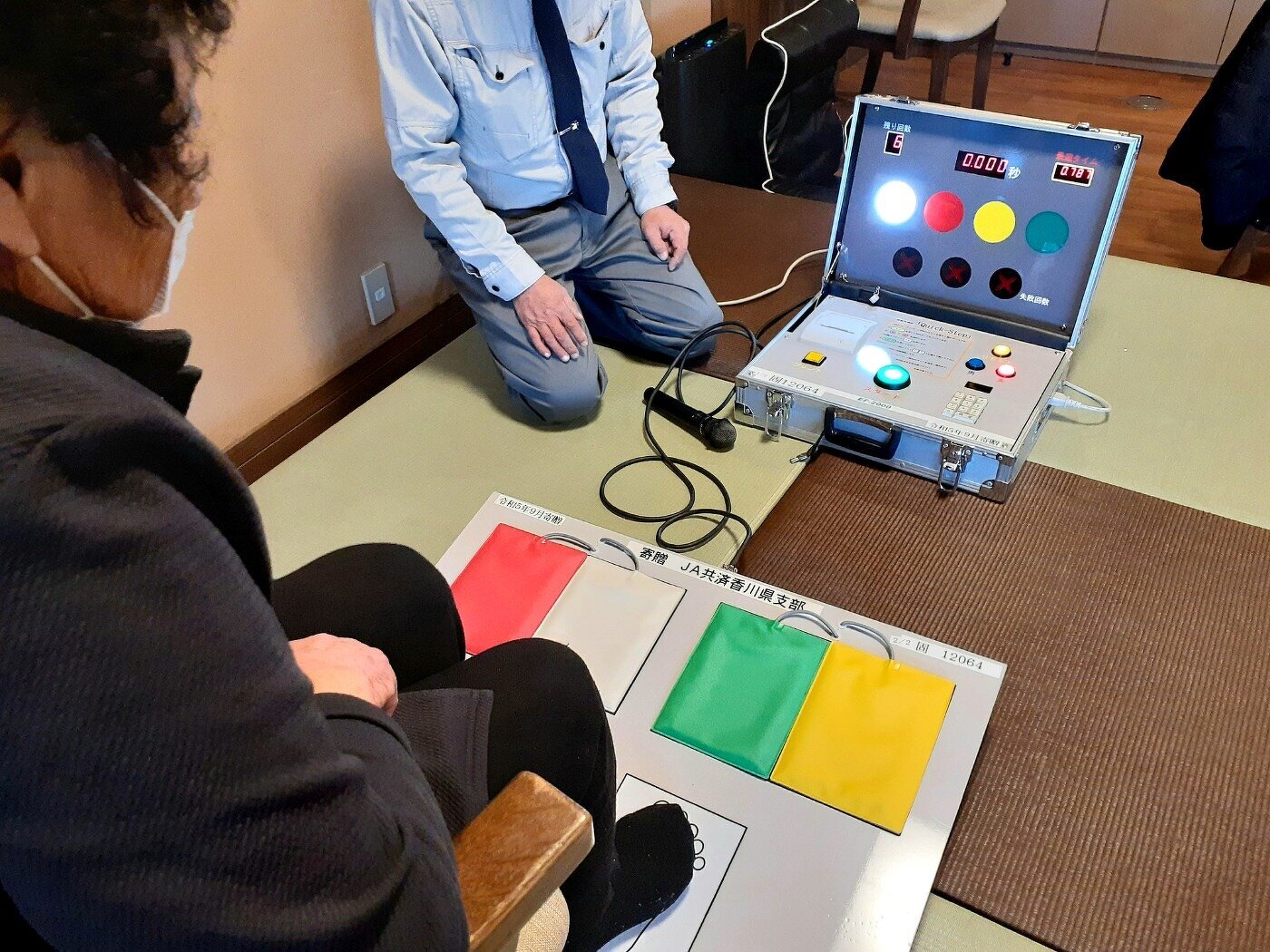 今回参加の皆さまは反応が早くパッパッと足が動いていました。その後のビデオ鑑賞でも自動車や自転車に気ぃつけないかんの、と感想が聞かれました。