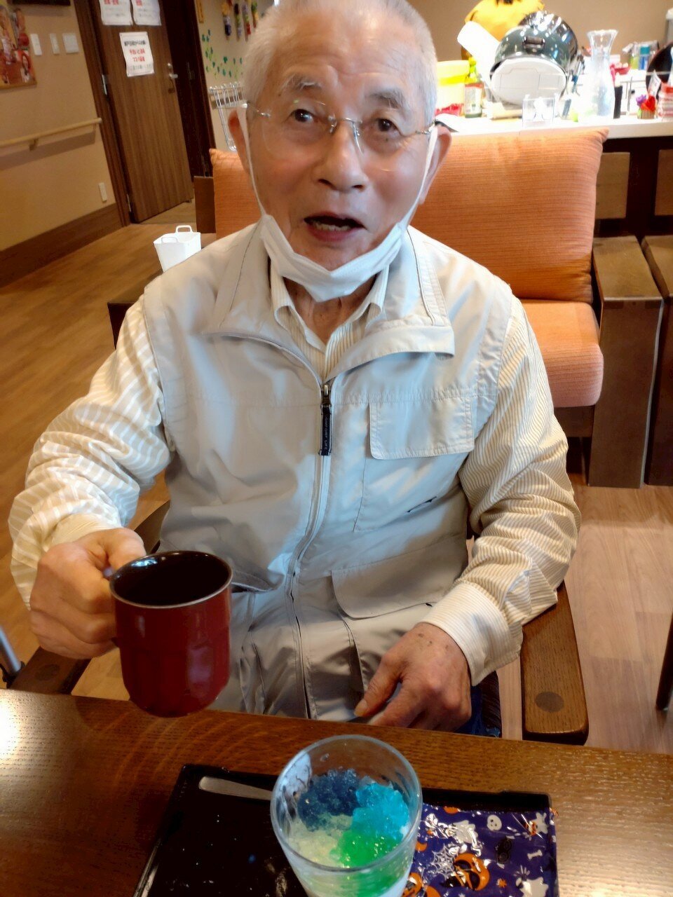 今日のレクリエーションは月1回のクッキング。蒸し暑くなり、喉ごしのいいさっぱりしたゼリーを作りました。