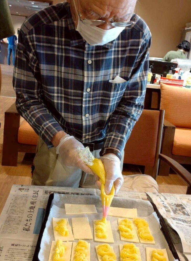 朝の挨拶の時間で午後のレクリエーションはおやつクッキングです、とご紹介するとパチパチと拍手が起こる女性陣。