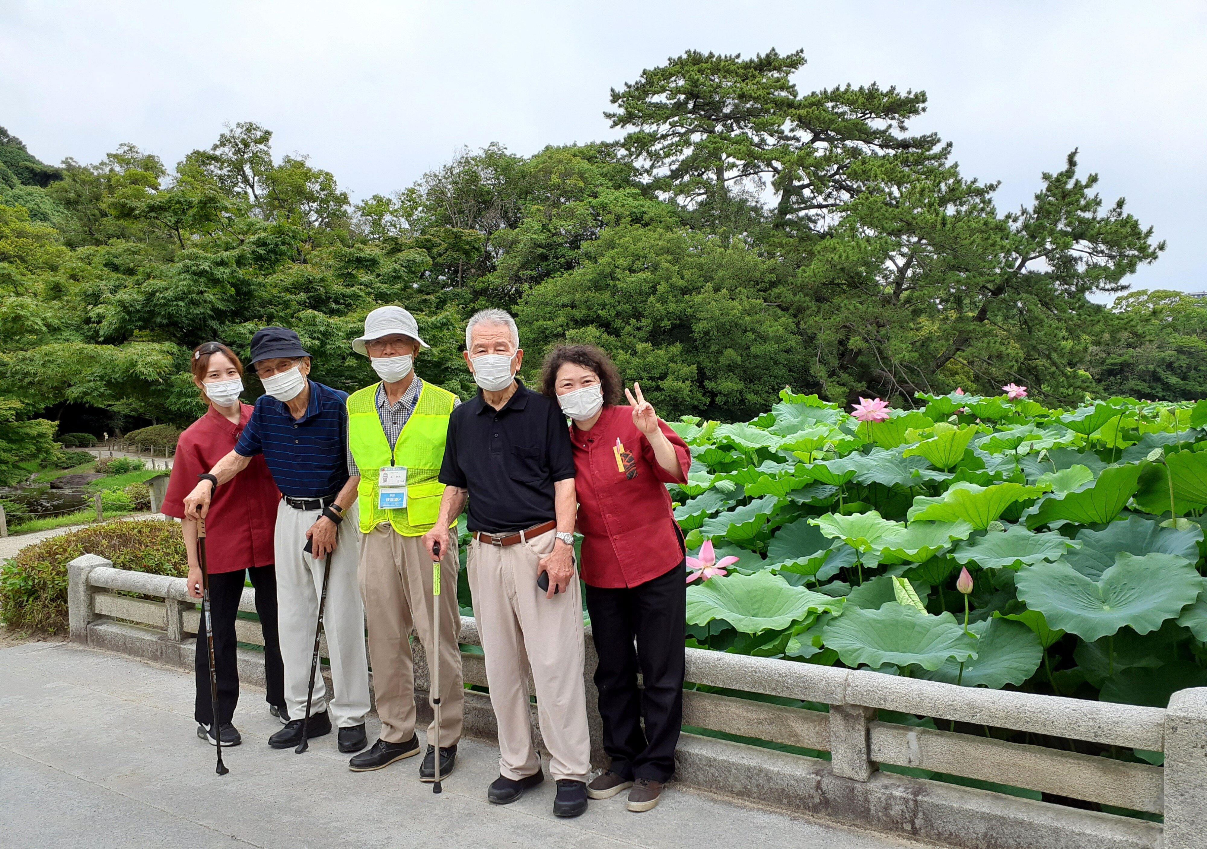今は蓮の花が見頃。立派な蓮の花と庭園美に驚きながら、今度は紅葉も見に来ないかんと笑顔の皆さまでした。