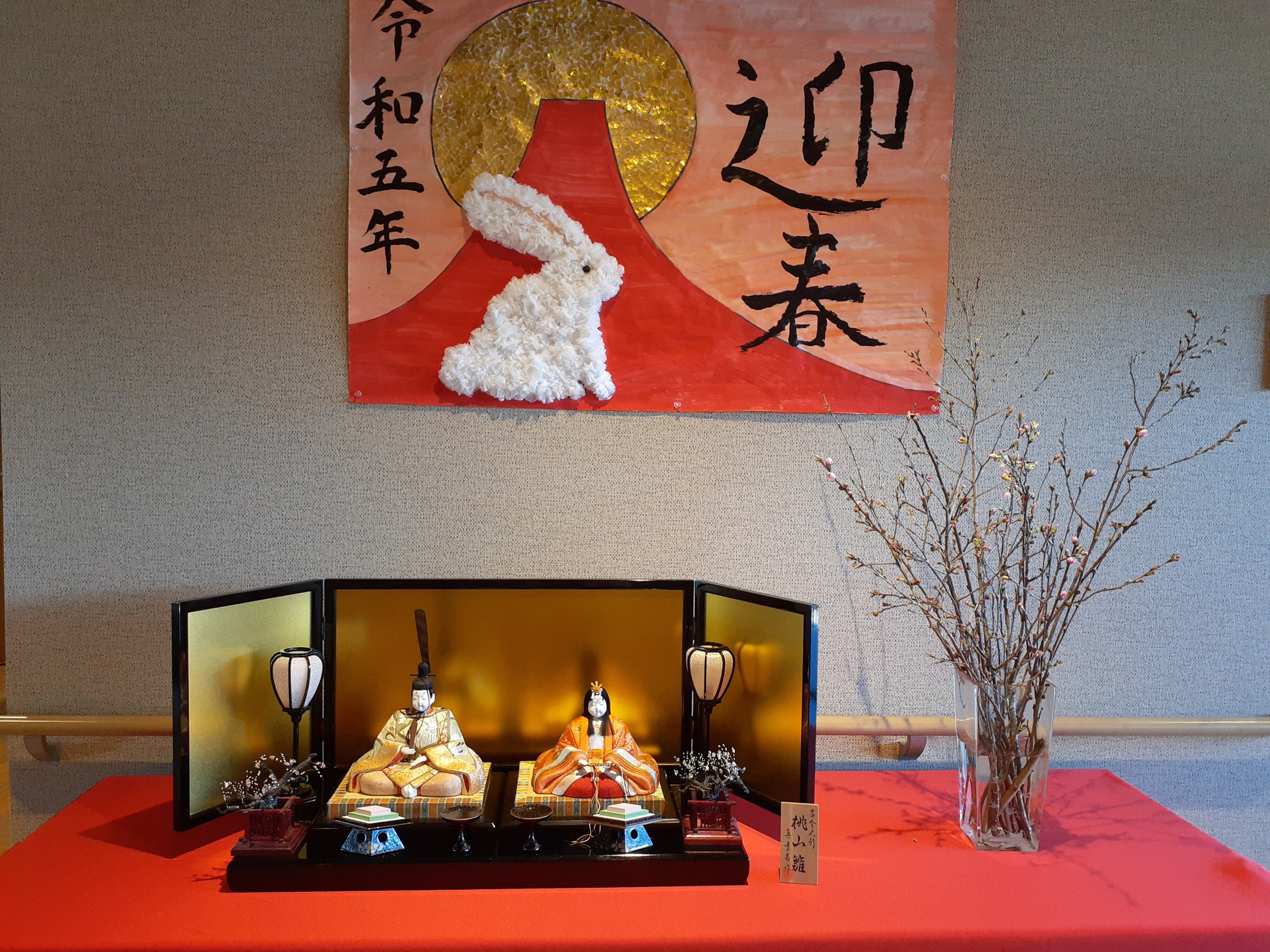先月の雨水の日から玄関ホールに飾ってあるお雛様。 いつも入居者様が眺めていらっしゃいます。 本番にあわせて桃と桜の花を活けました。今日は暖かかったので蕾がフワッと花開きました。