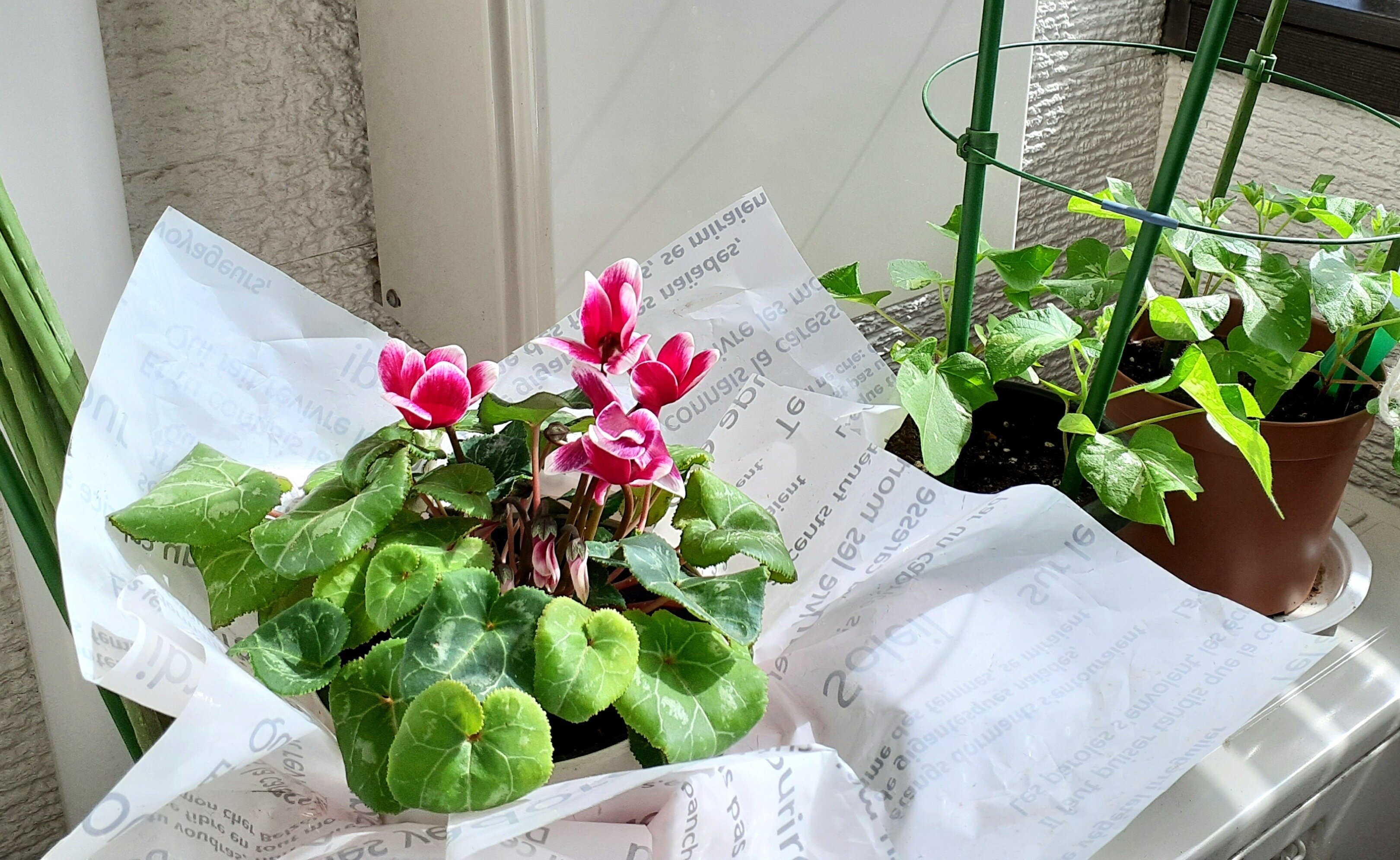 「見て見て。シクラメン、お花が今頃咲いたんよ。」