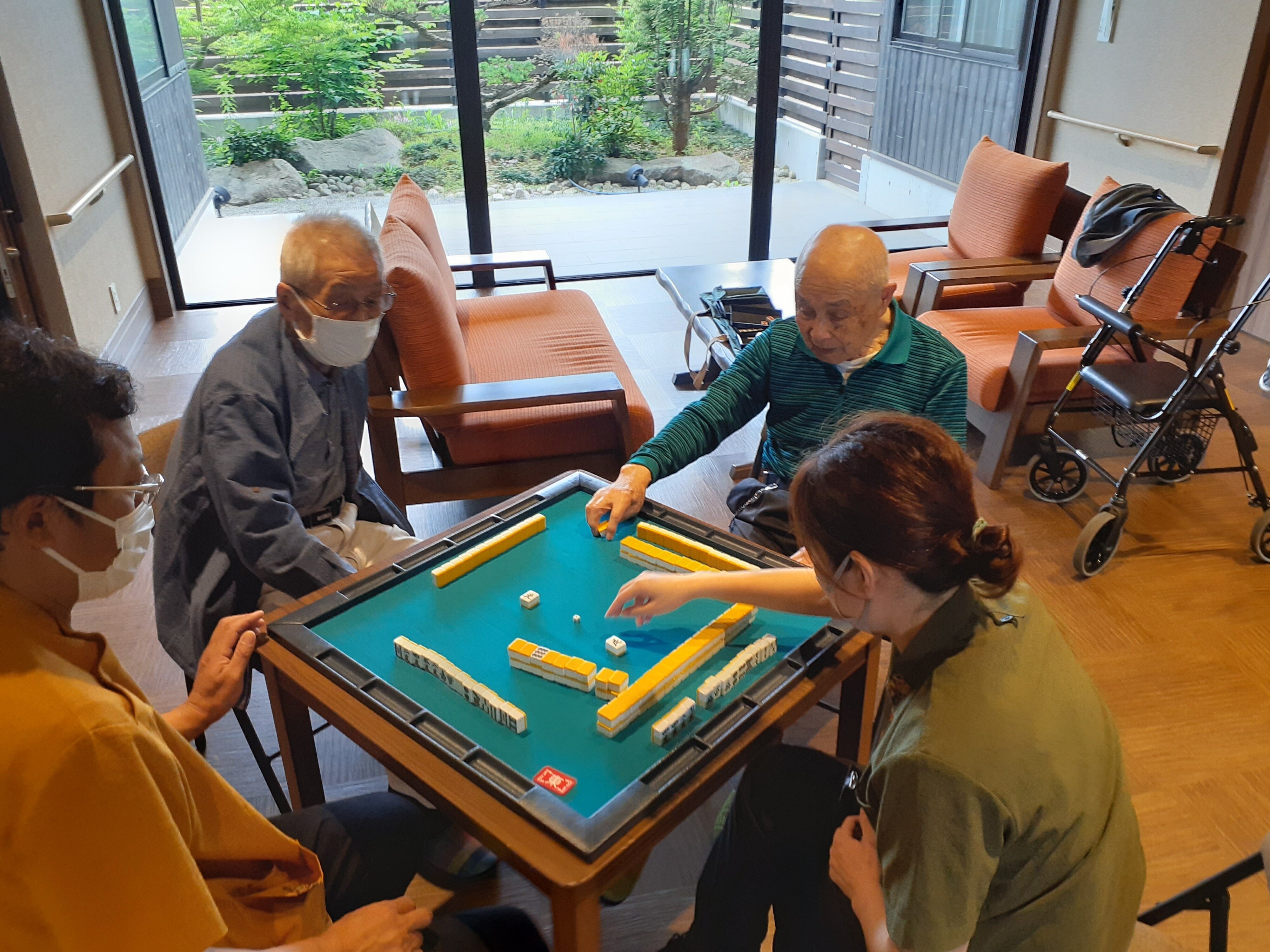 麻雀を覚えたいというスタッフに入居者さまが付き合うよ、となり急遽にわか雀荘開催(笑) だんだん要領がわかってくるスタッフに入居者さまも熱が入り真剣な表情に。 近いうちに麻雀倶楽部が設立するかも!?