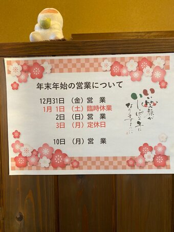 年末年始の営業日のお知らせです。 通常定休日は月曜日となっております。 寒くなって来たので、暖かい格好でお越しください。